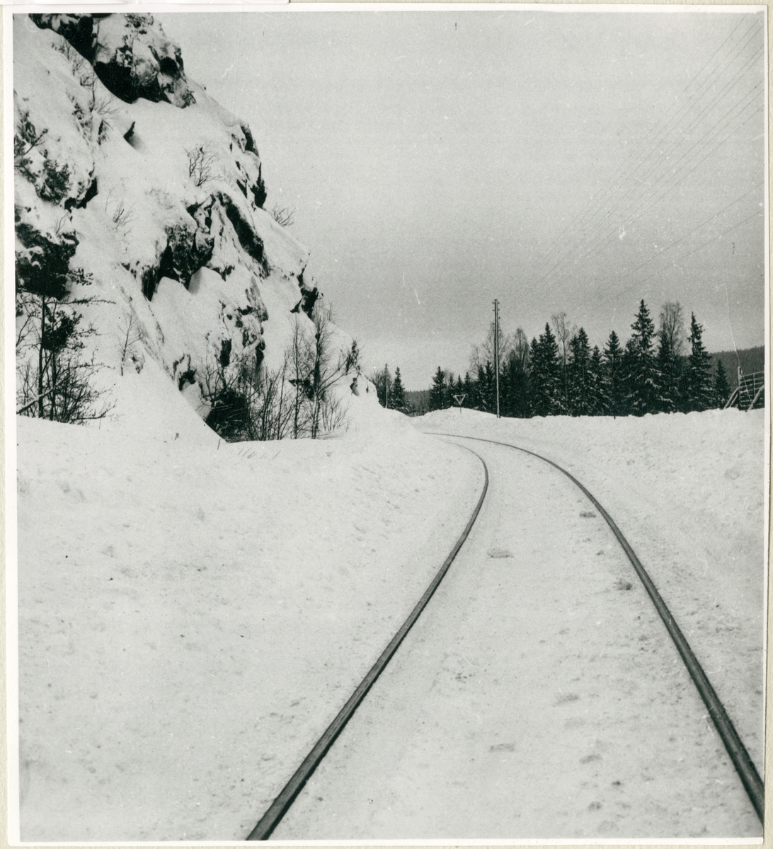Järnvägslinje vid berg mellan Utansjö och Oringen under vintertid.