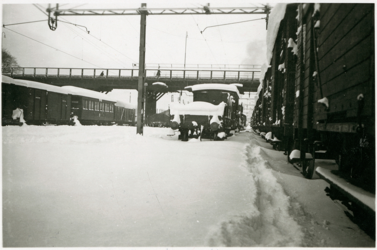 Titel: Bangård med vagnar och vy på bro under vintertid.