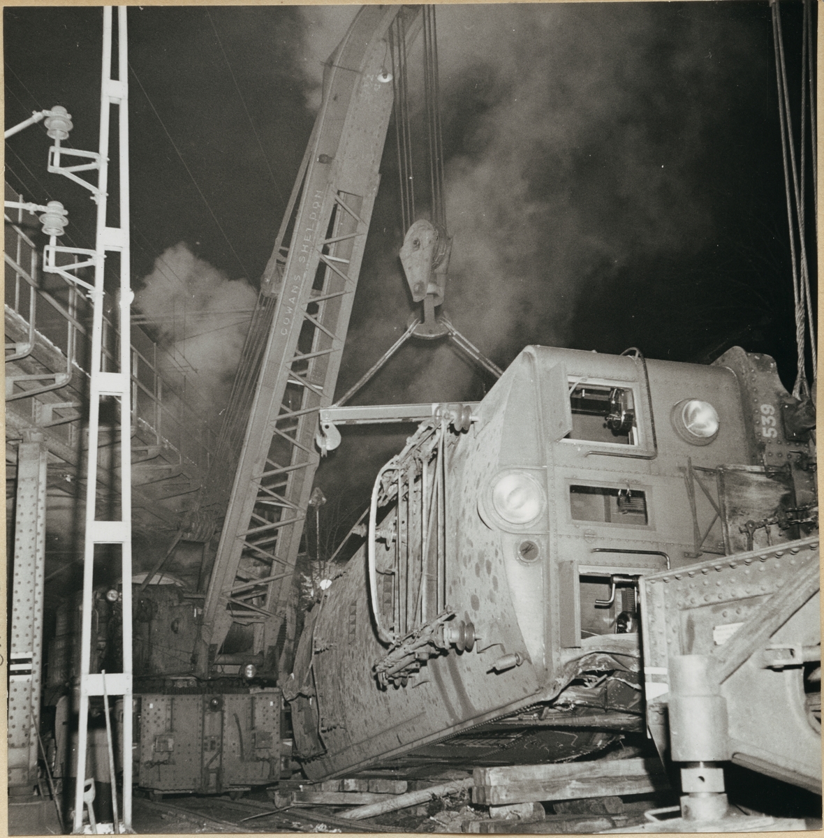 Ångkran Statens Järnvägar, SJ A1 "Nässjö" kunde komma fram under viadukten i lyftläge. SJ Dk 539 är det förolyckade elloket.