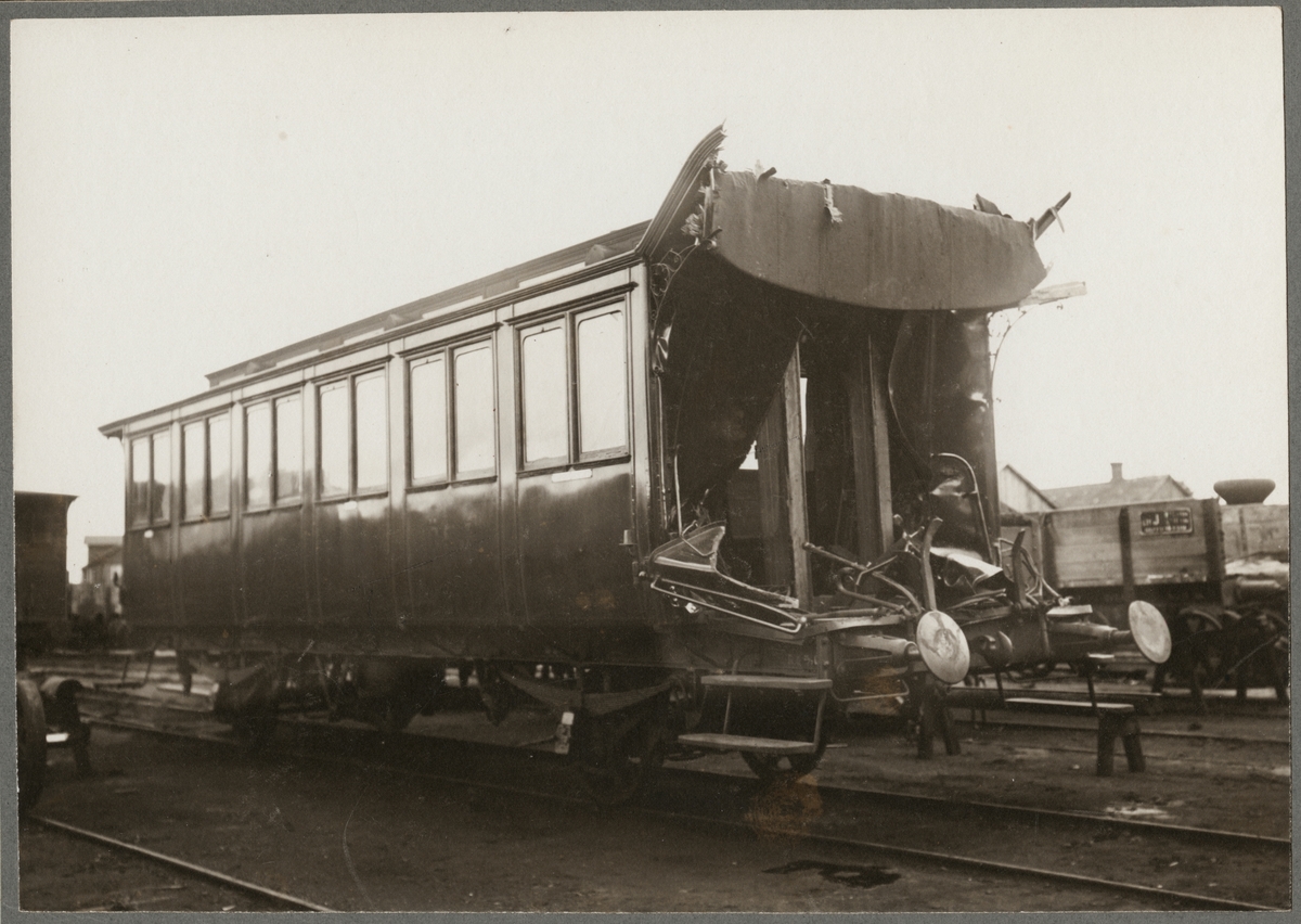 Personvagn med skador från tågolycka.