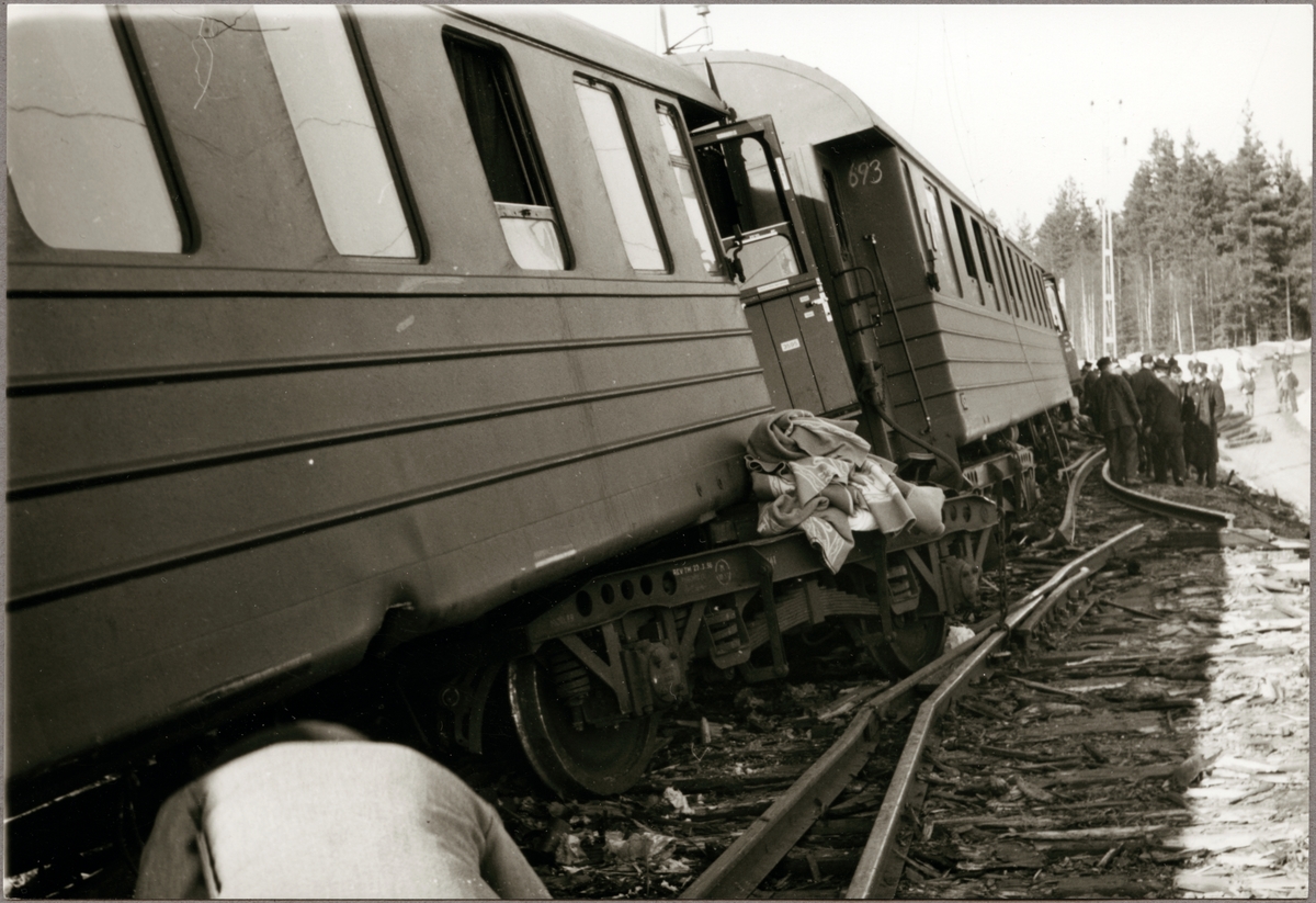Titel: Urspårade vagnar med personal i bakgrunden.