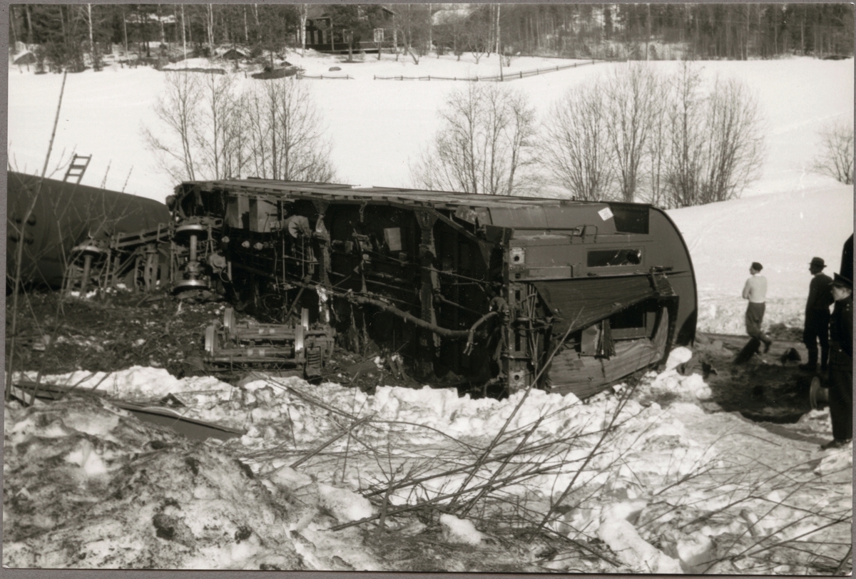 Titel: Urspårade vagnar under vintertid med resande och personal i bild.