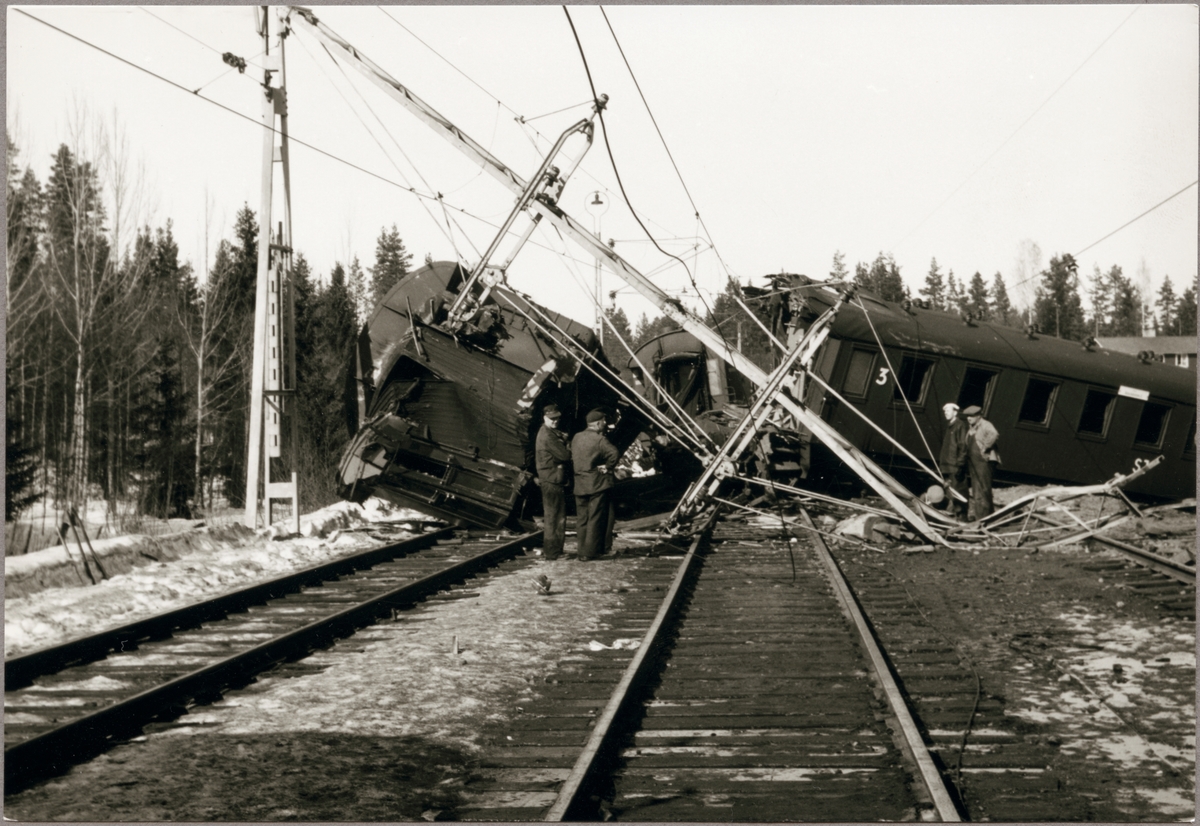 Titel: Vy på personal vid nedriven kontaktledningsbrygga och urspårade vagnar.