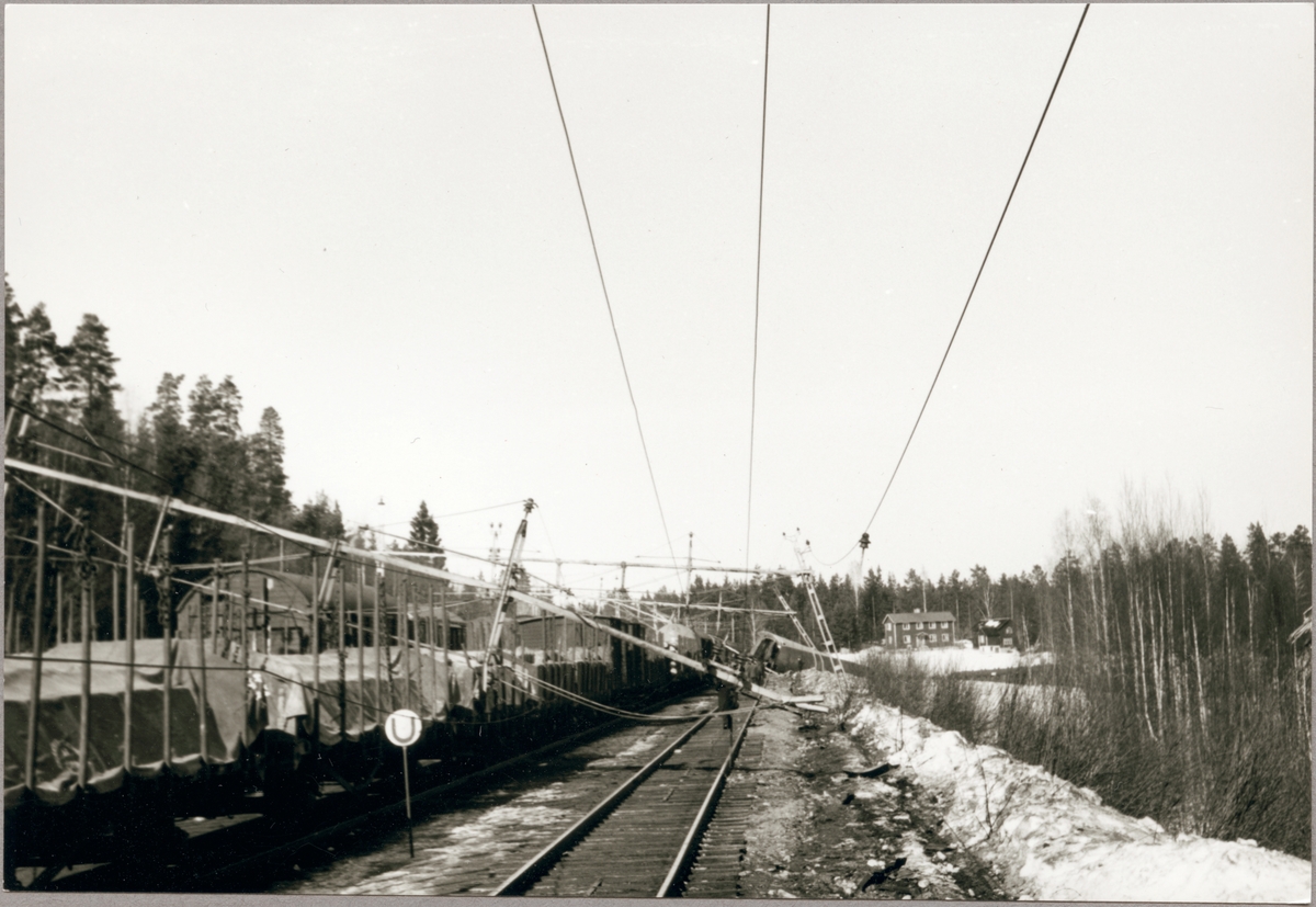 Titel: Vy på bangård efter tågolycka med nedriven kontaktledning i bild.