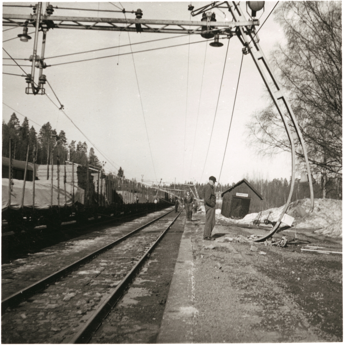Titel: Vy på bangård efter tågolycka med skadad kontaktledningsstolpe.