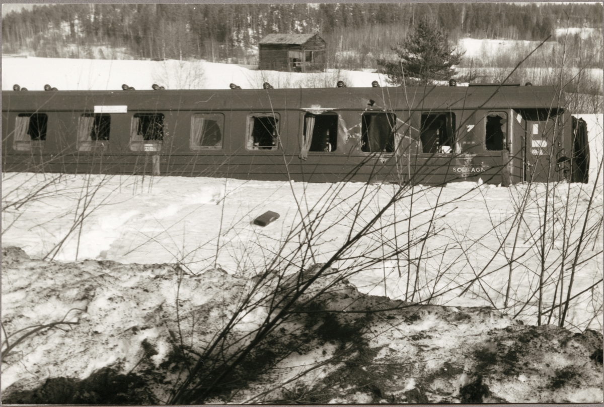 Titel: Urspårad sovvagn efter tågolycka under vintertid.
