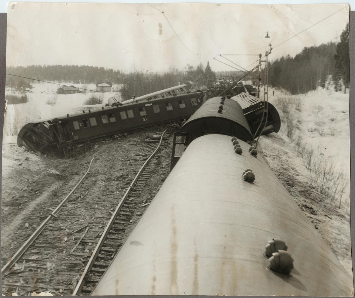 Titel: Urspårade vagnar efter tågolycka på linjen mellan Holmsveden och Järvsö.