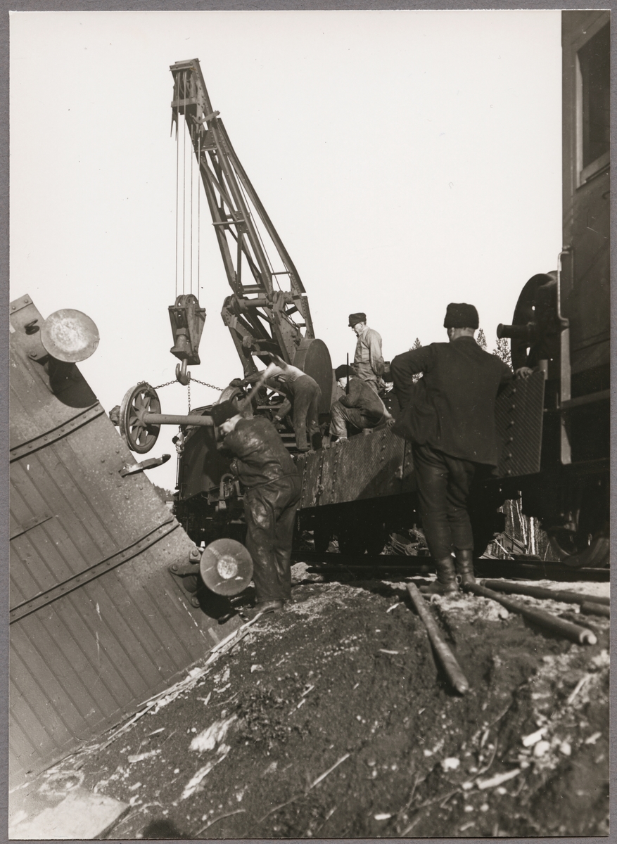 Bärgning av godsvagn med hjälp av en lyftkran efter olycka mellan Gastsjön och Kälarne i Jämtland på 1920-talet.