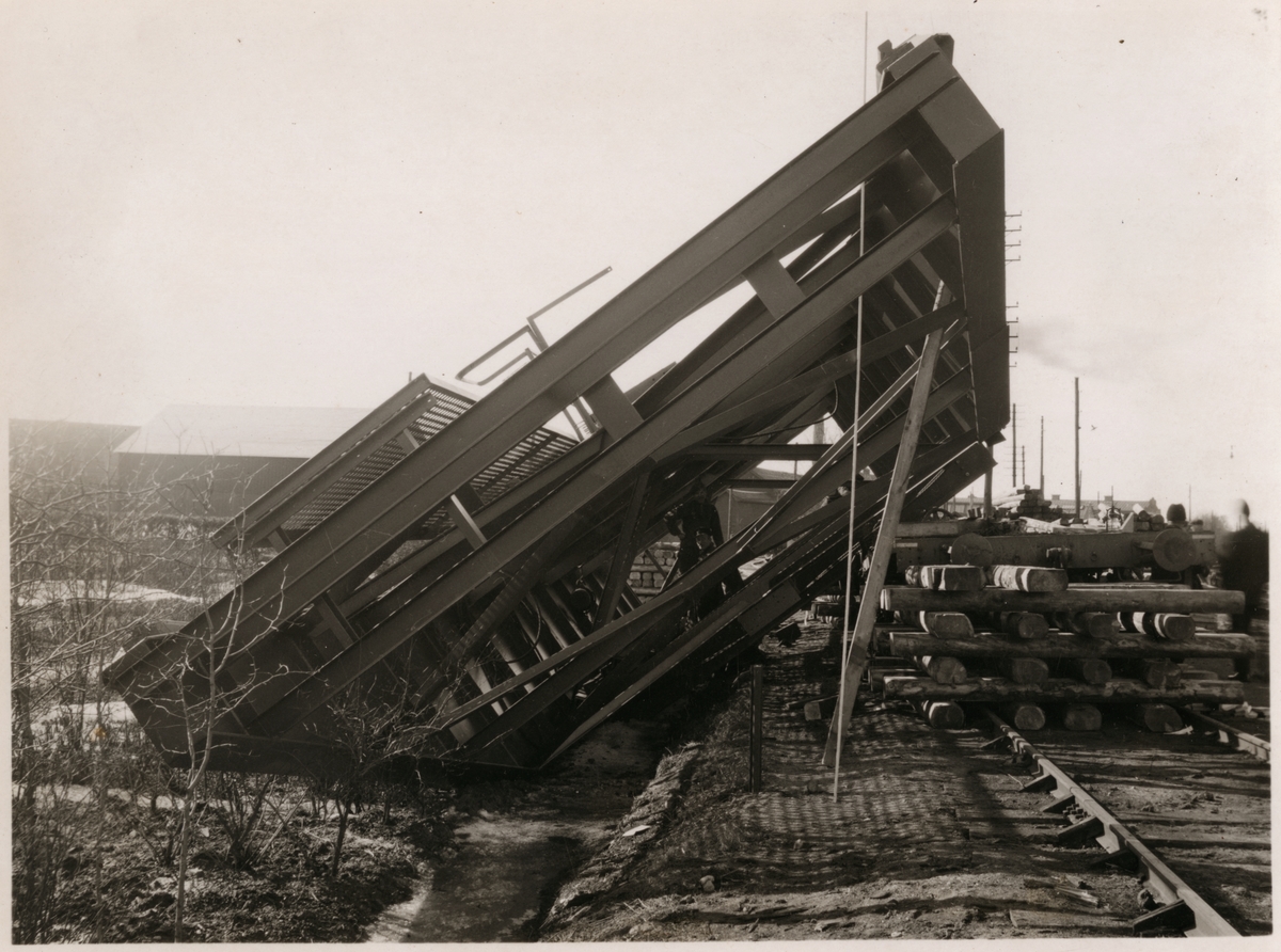 Titel: Kranbrygga har vält vid transport mellan Aseas mekaniska verkstad och Västerås bangård april 1937.