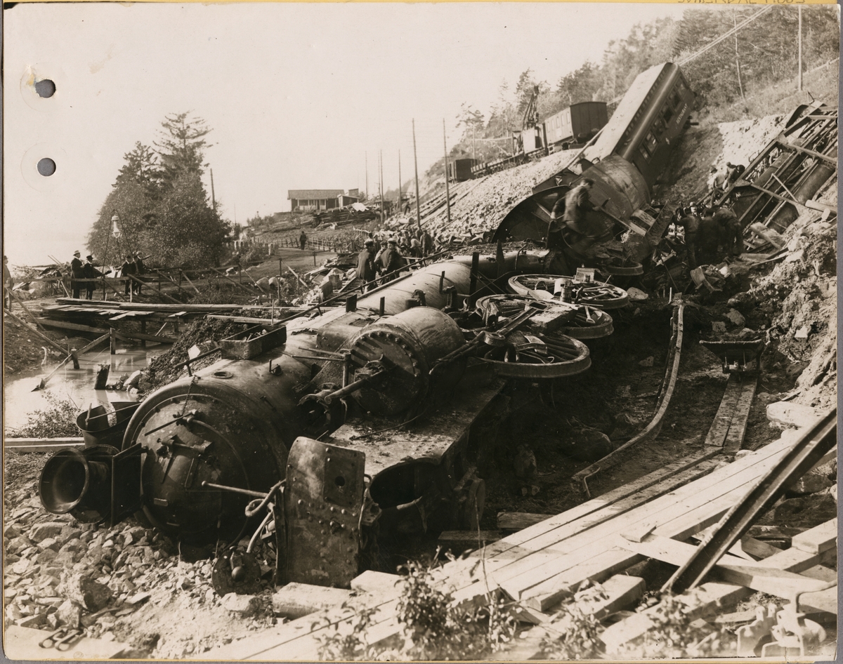 Olycksplatsen i Getå där Statens Järnvägar, SJ F 1200 och SJ ABo3 2466 har rasat nedför slänten. Olyckan orsakades av ett jordskred den 1 oktober 1918.