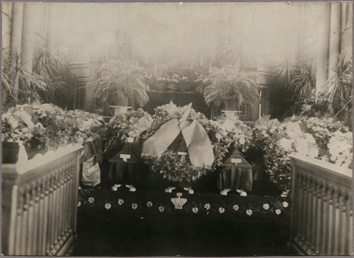 Kistor med omkomna från Getåolyckan under begravning i Matteuskyrkan, Norrköping.