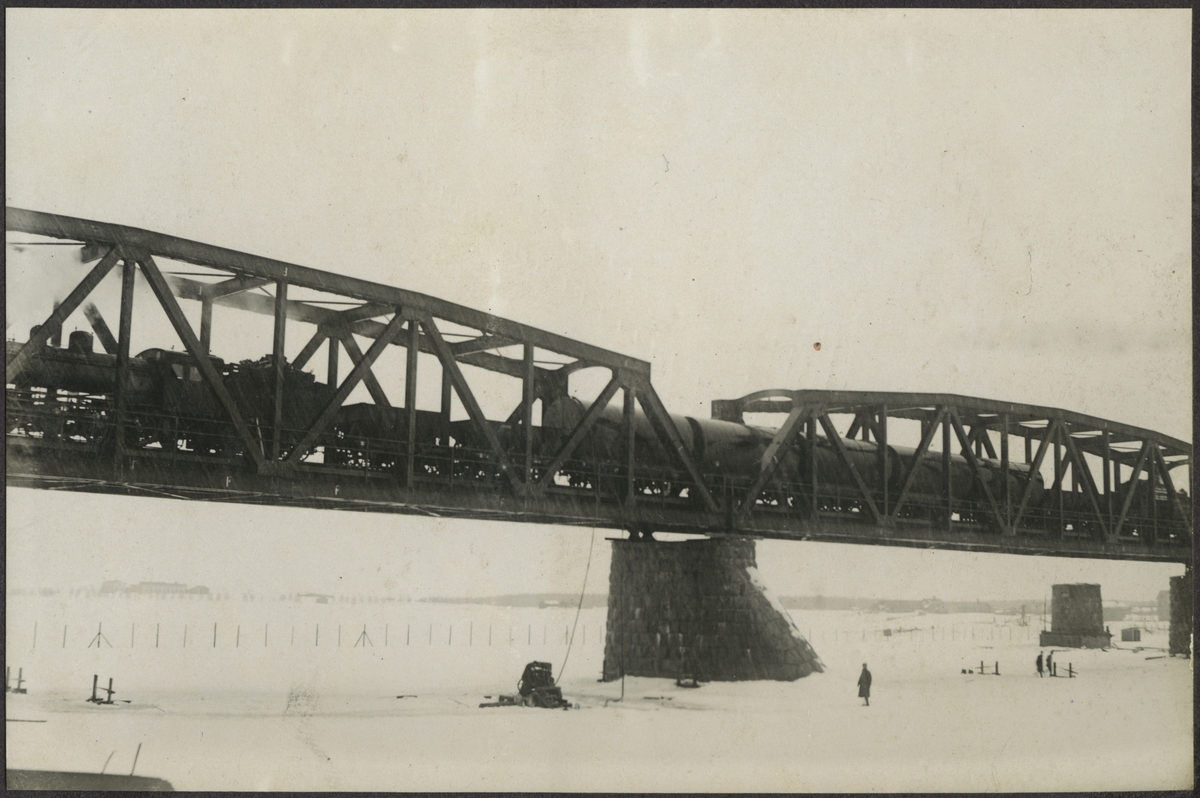 Titel: Brobyggnaden över Torne älv. Provbelastning. Banan och bron över gränsen byggdes 1919.