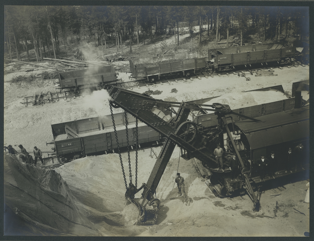 Bycyrus grävmaskin och Io-vagnar i grusgropen vid km.2