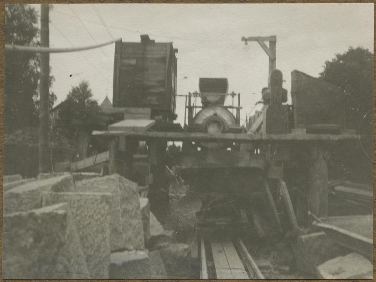 Dubbelspårsbyggnaden mellan Alingsås - Olskroken. Bron över Säveån södra brohalvan. betongbladningsmaskin Wesco med hiss i arbete.