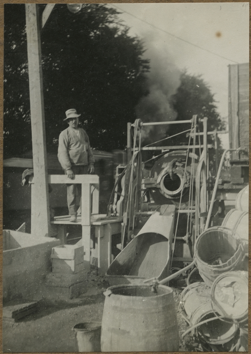 Dubbelspårsbyggnaden mellan Alingsås - Olskroken. Bron över Säveån södra brohalvan. betongbladningsmaskin Wesco med hiss i arbete.