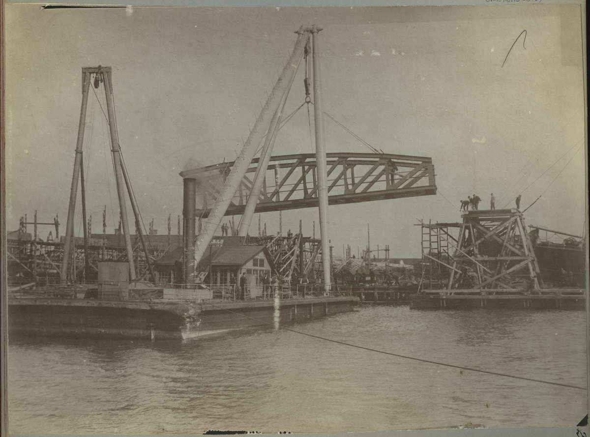Brobygge över Göta Älv.Den första av 3 32 meters fasta brospannen över Göta Älv för Statsbanan genom Bohuslän under upplyftning på pråmställning.