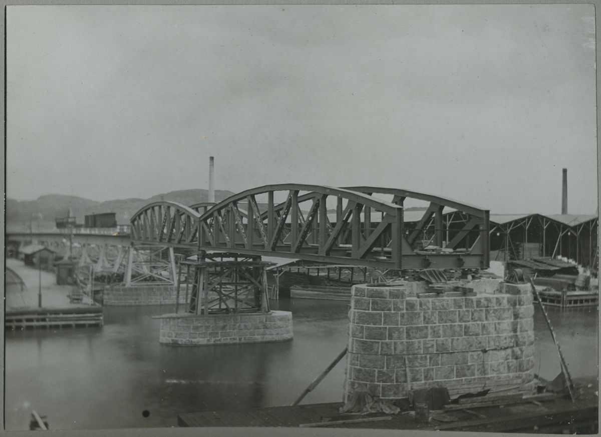 Brobygge över Göta Älv, andra spannet under uppläggning.