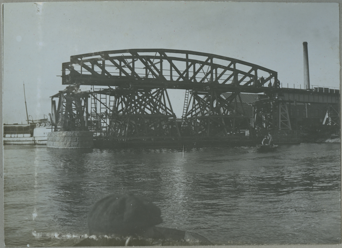Brobygge över Göta Älv, första spannet under uppläggning.