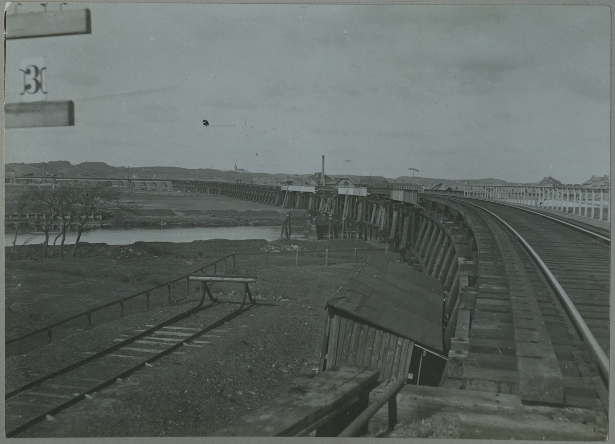 Titel: Provisorisk viadukt vid Göteborgs slakthus och över Säveån. ( Olskroken )