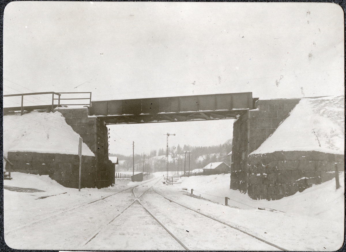 Titel: Album med fotografier från Bohusbanan. Bro vid korsning med UL järnväg. Uddevalla-Lelångens järnväg.