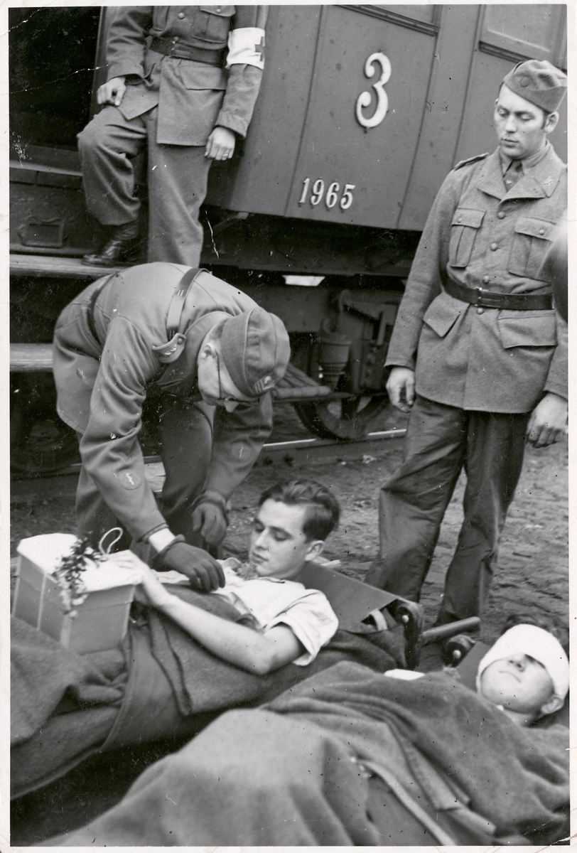 Titel: Sårade tyska soldater tas ombord på svenskt sjukhuståg.