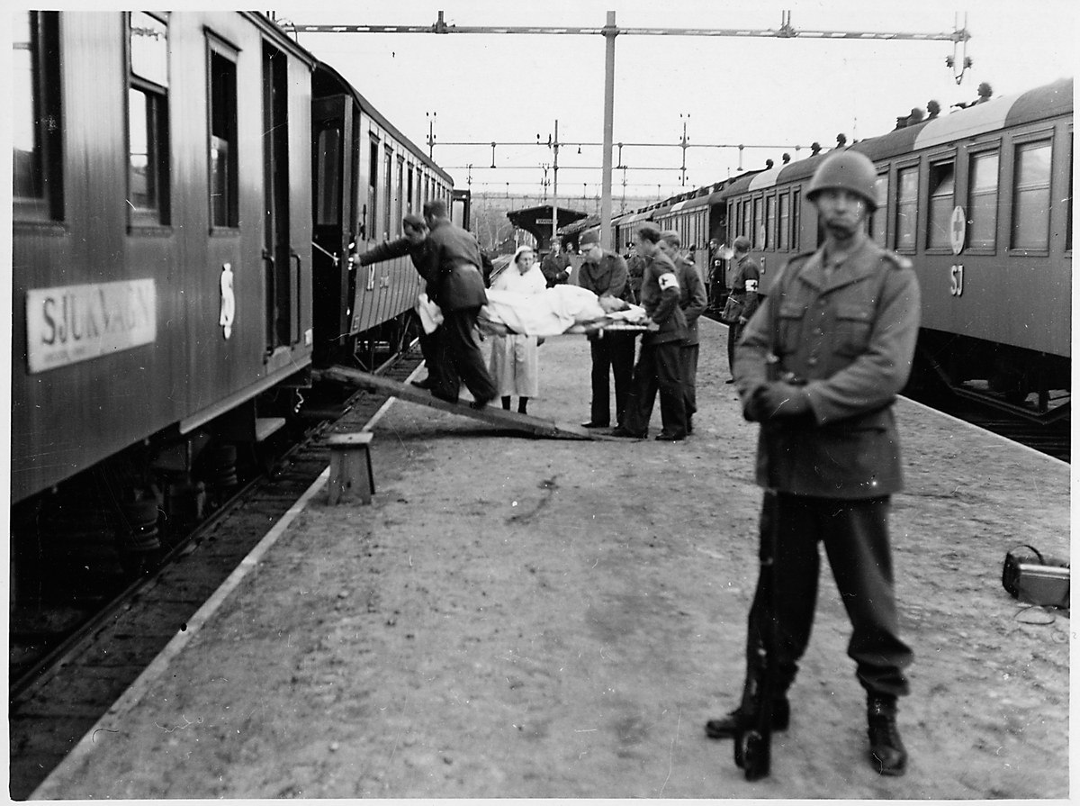 Titel: Sårade tyska soldater bärs ombord på svenskt sjukhuståg.