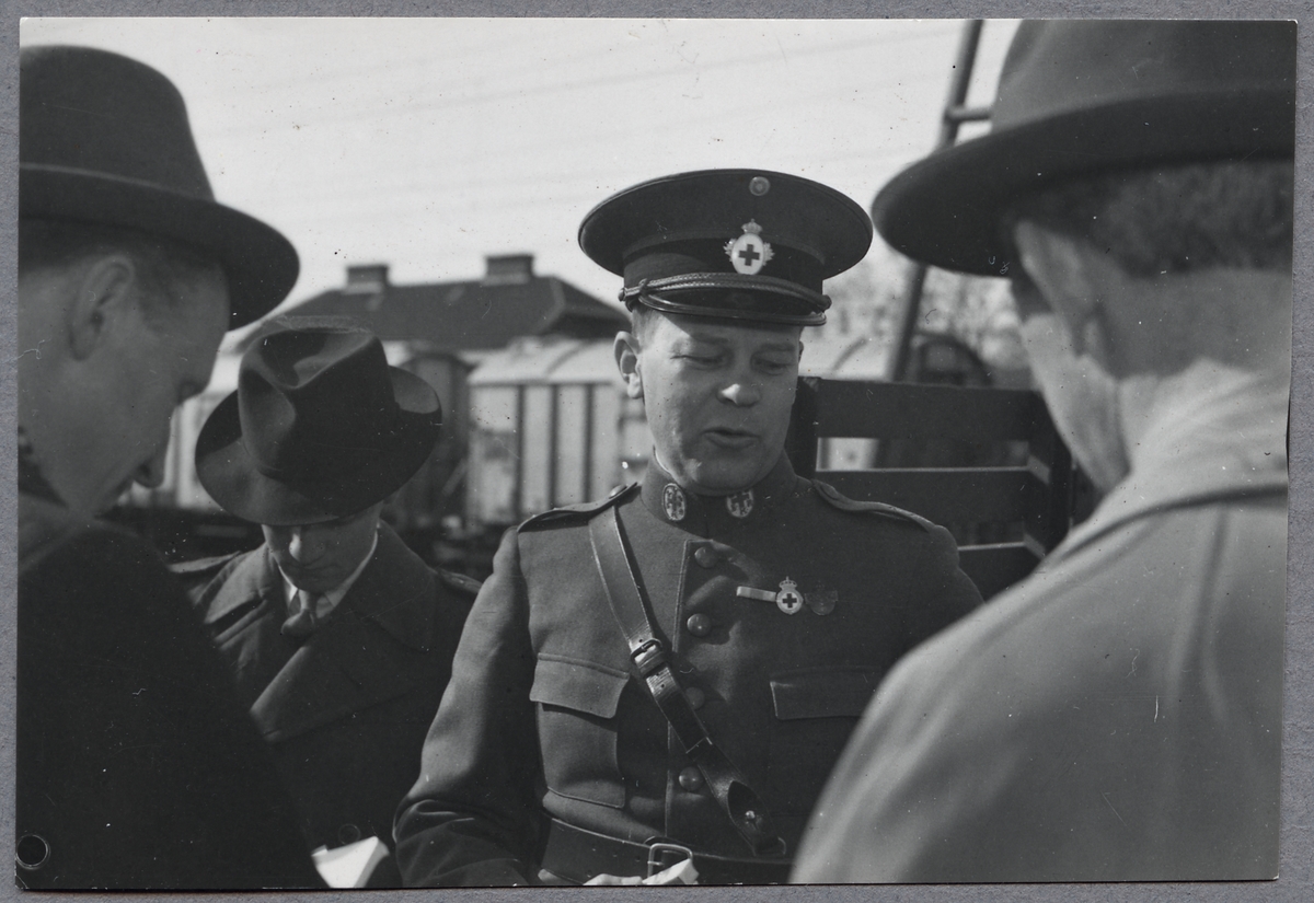 Rödakorslöjtnanten Uno Rehnvall i samspråk med journalister i samband med att ett tyskt sjukvårdtåg passerar Hallsberg under Andra Världskriget.