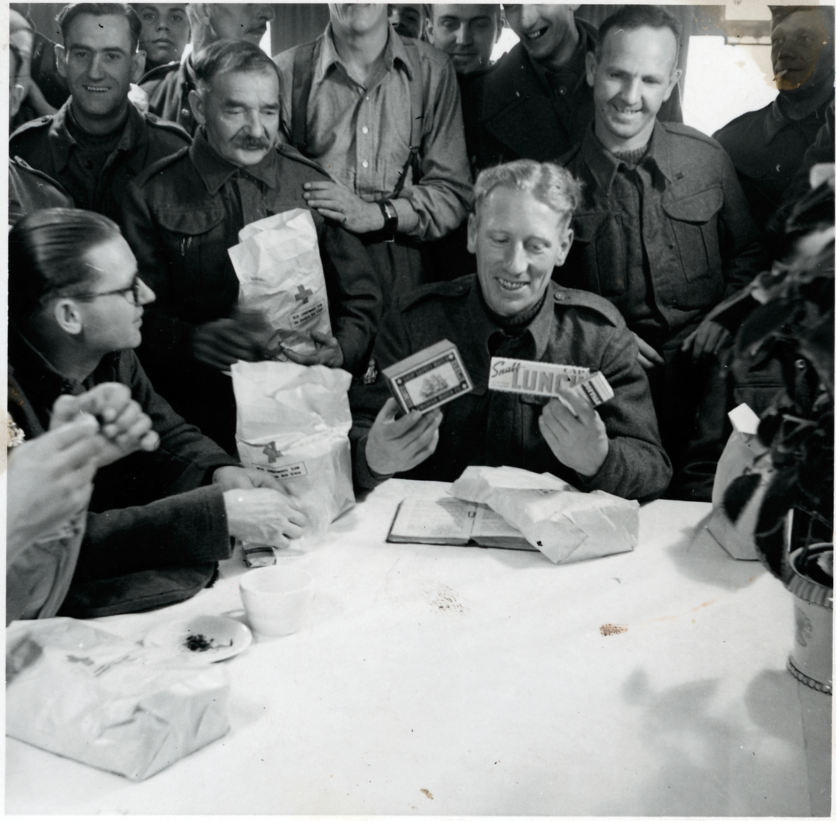 Titel: Krigsfångar som har fått förnödenheter av Röda Korset.