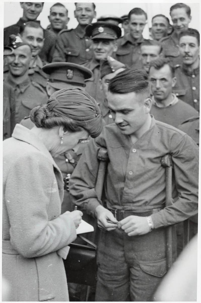Titel: Svenska kronprinsessan Louise skriver autografer till brittiska krigsfångar i Göteborg.