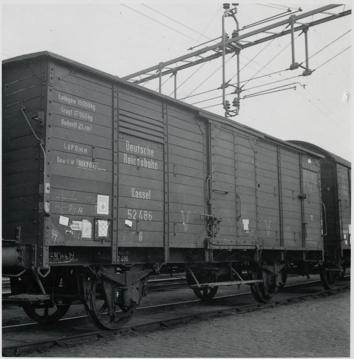 Tysk godsvagn med militär last. Deutsche Reischbahn, DR G 52486.