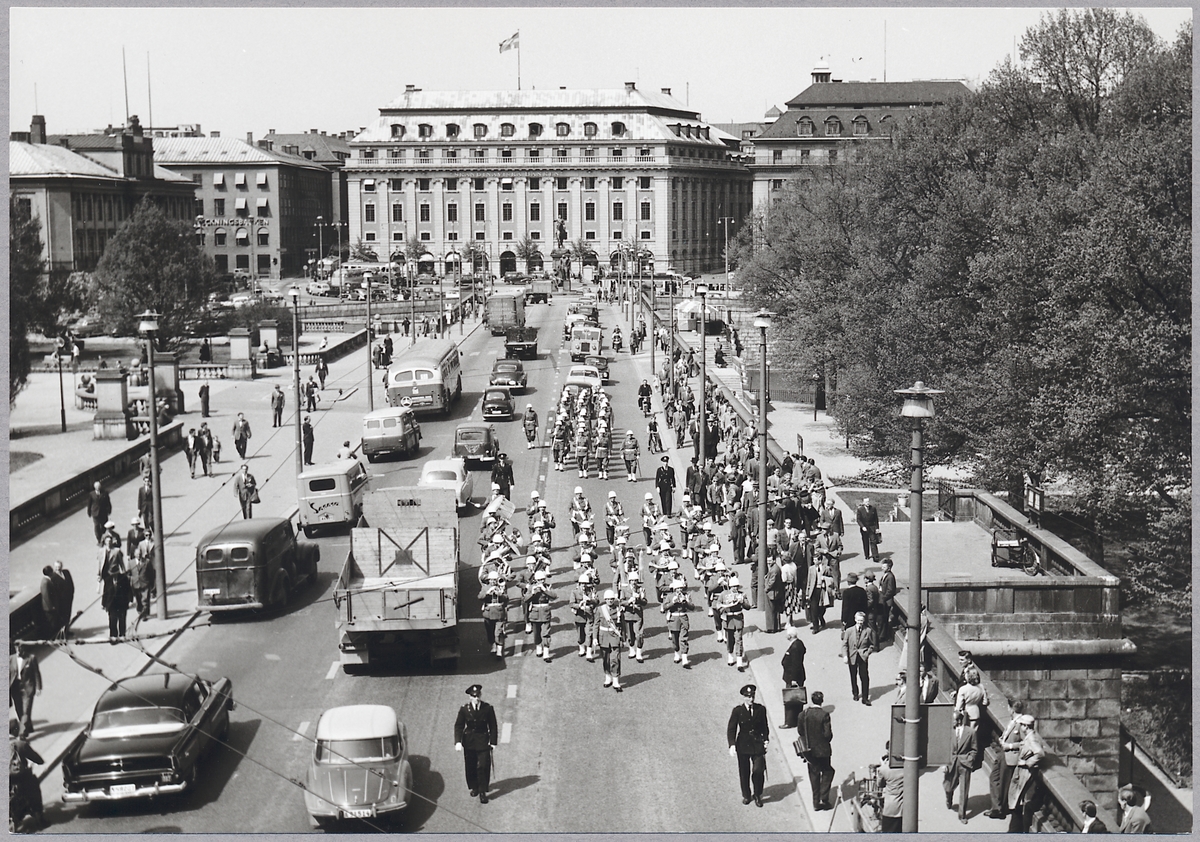 Statens Järnvägar SJ driftvärn, Karlshamns division, går vaktparaden längs Norrbro i riktning mot Kungliga slottet.