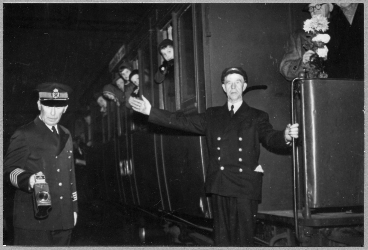 Sista tåget på Krylbo - Norbergs Järnväg. KNJ personvagn 4. Konduktör Lindström står på vagnens trappsteg.