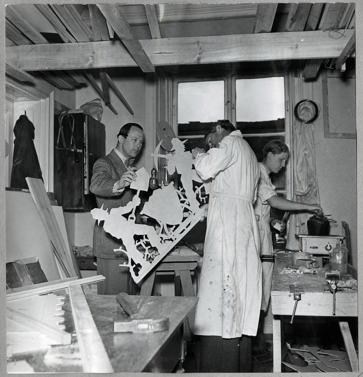 Bokhållare Julner, Kontorsvakt Sundberg och praktikant Sandberg i ateljé.