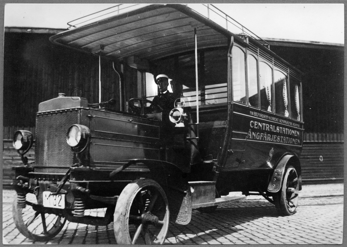 Gamla bussen Malmö Central - Ångfärjestationen. Statens Järnvägar, SJ's första buss.