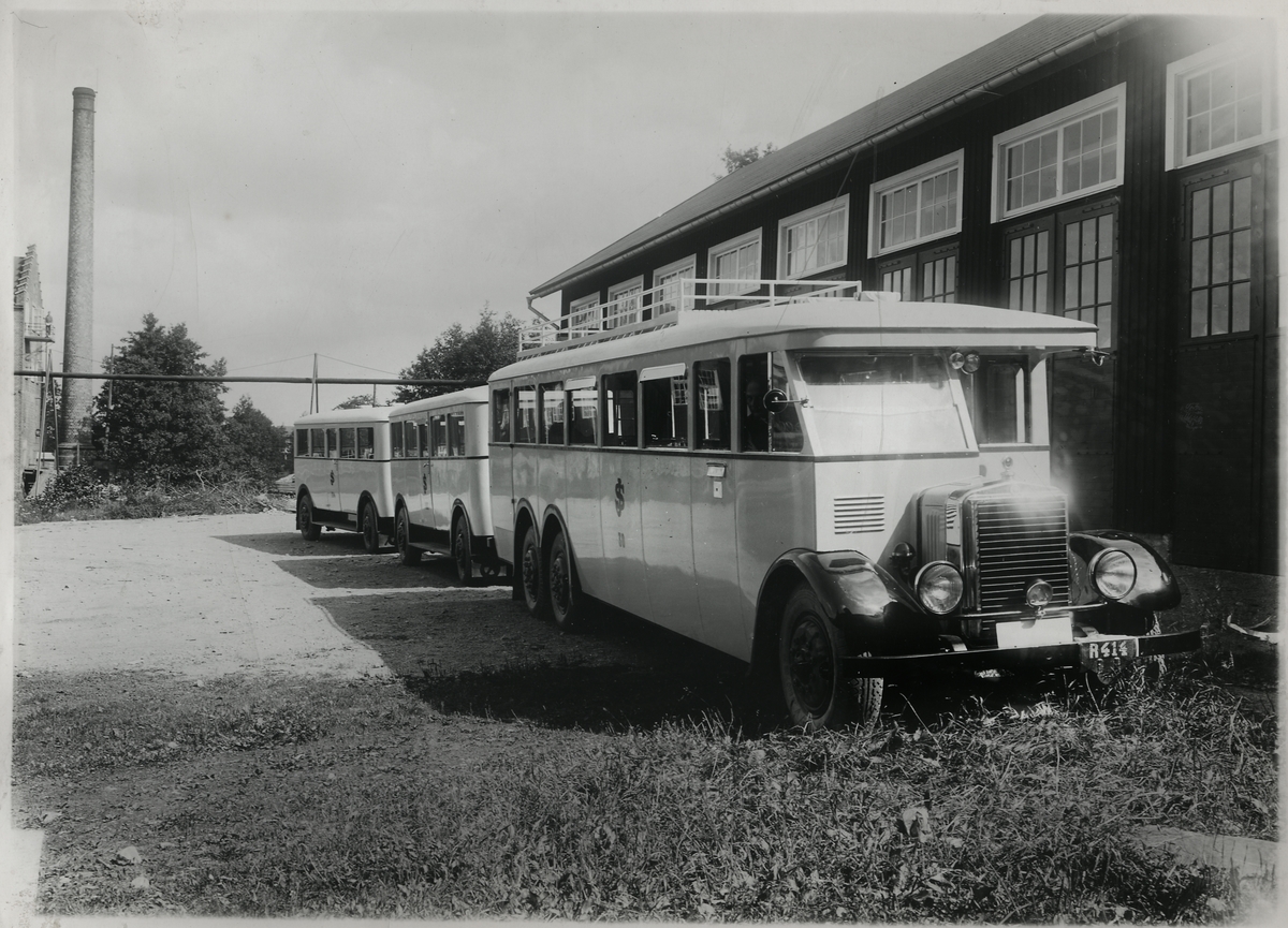 Tidaholmbuss med personsläpvagnar. Statens Järnvägar, SJ buss 30, SJ släp 103 och SJ släp 104.