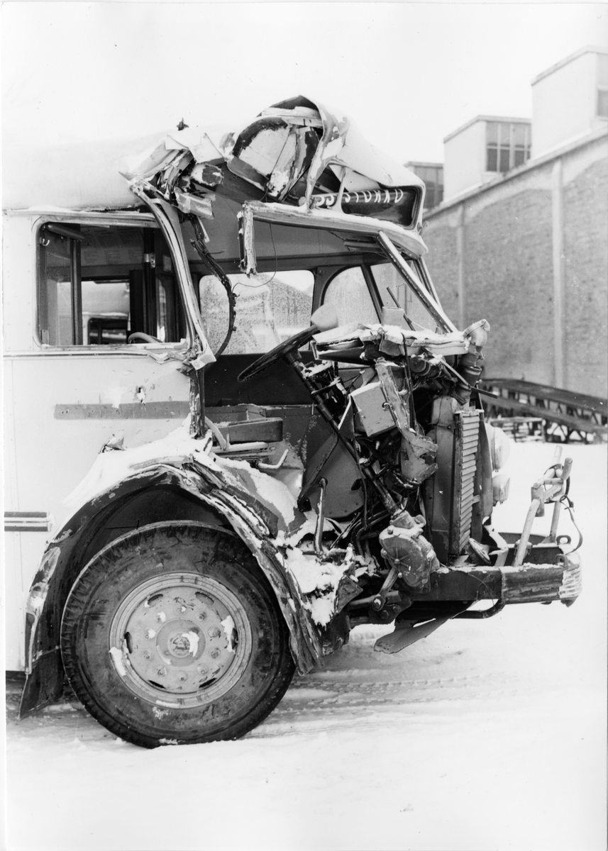 Statens Järnvägar, SJ buss 1985. Krockskadad Buss Volvo B617.