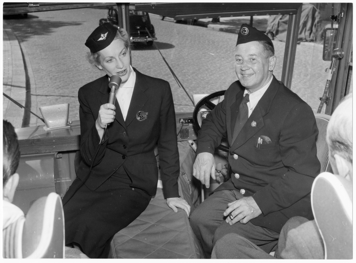Bussvärdinna och chaufför i en turistbuss. Statens Järnvägar, SJ buss 2286.