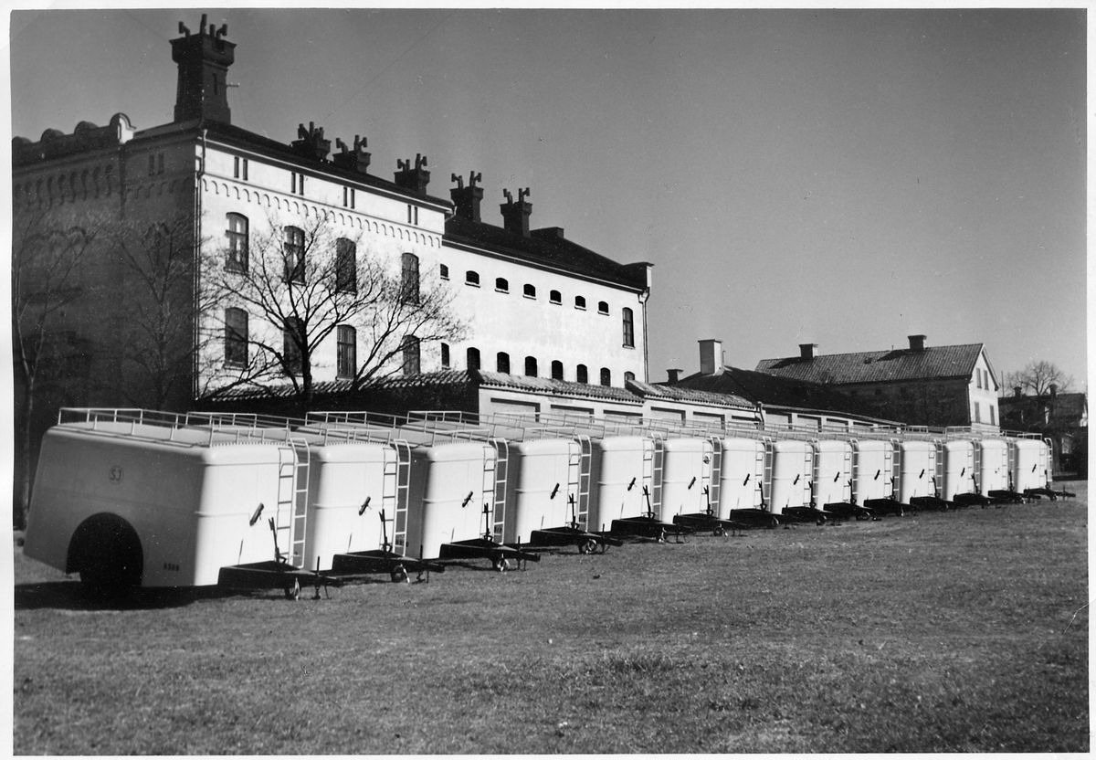 Titel: Fjorton Statens Järnvägar släpvagnar uppställda på rad.
