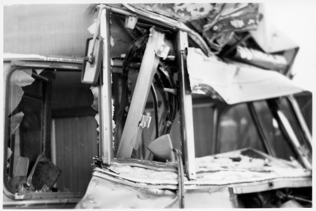 Detaljer på krockskadade bussen Statens Järnvägars, SJ buss 2138.