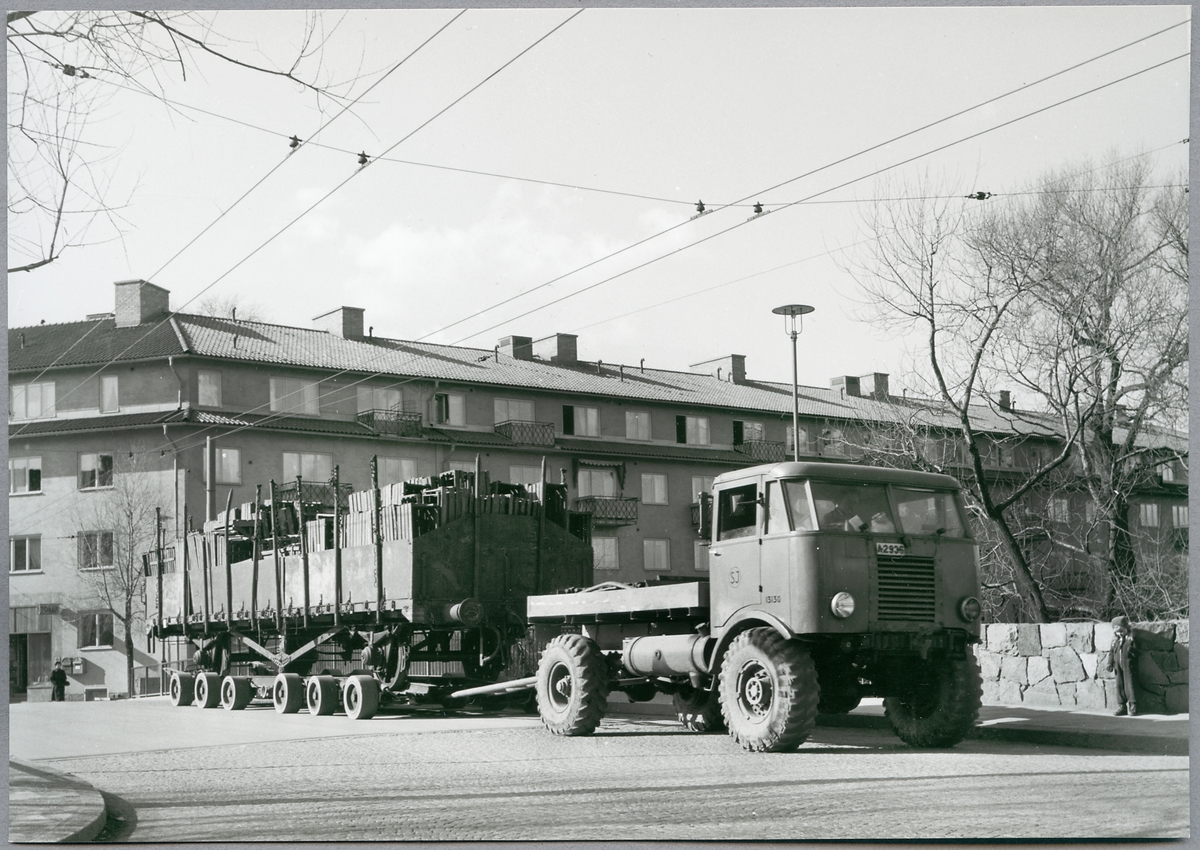 Titel: Transport av godsvagn på vagnbjörn. Kontaktledningarna är till för elbussar.