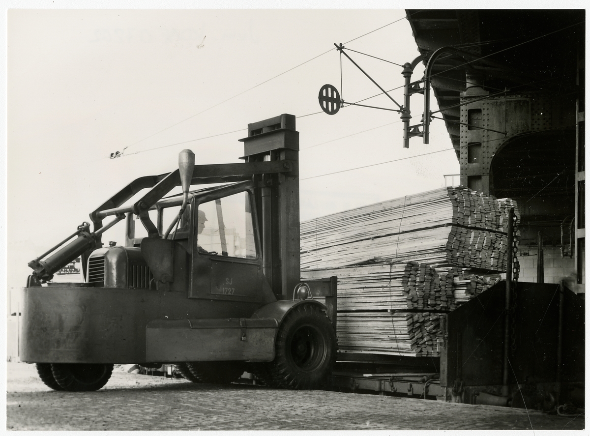Titel: Virkeshantering med större gaffeltruck i Liljeholmen.