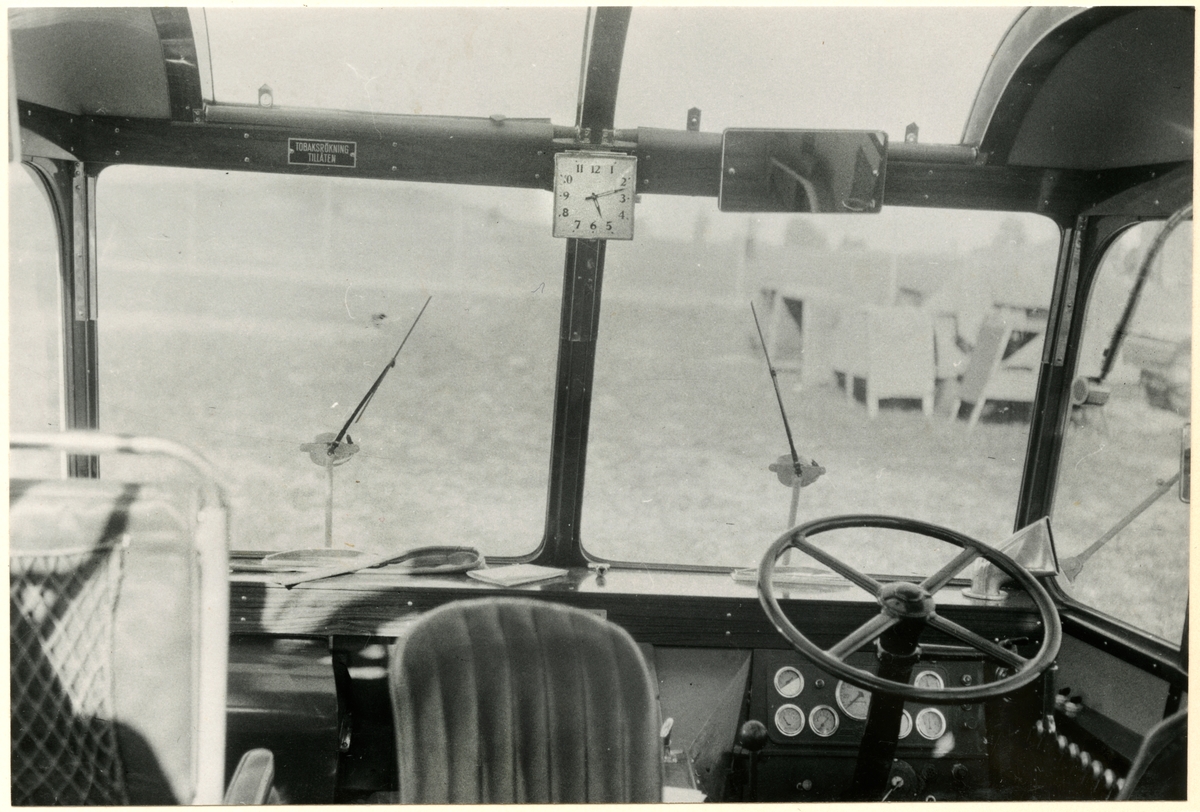 Titel: Interiör längst fram vid förarpositionen på buss.