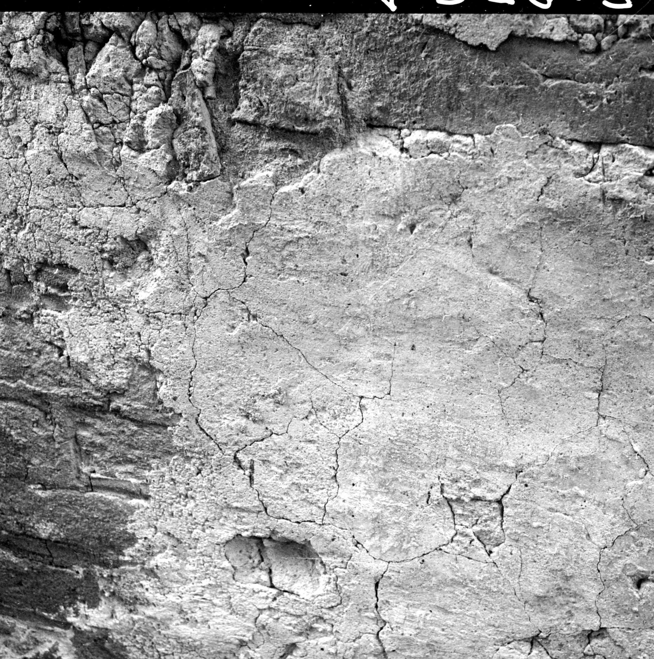 Prov på ursprunglig puts på tornets hörnpelare. Byggnadshistorisk undersökning i samband med omputsning 1963.Foto nr. 23.