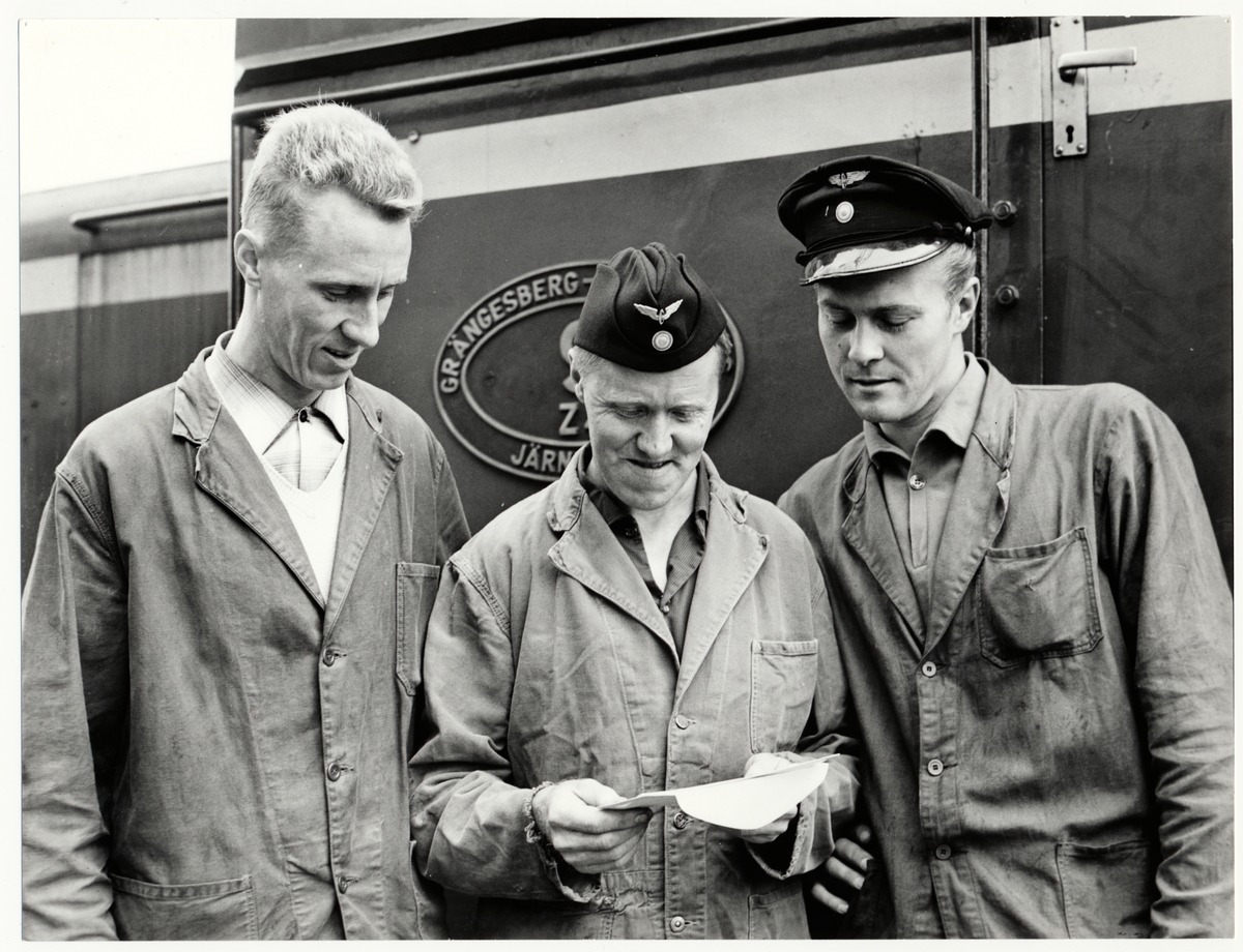 Trafikaktiebolaget GrängesbergOxelösunds Järnvägar, TGOJ personal framför lokomotor.