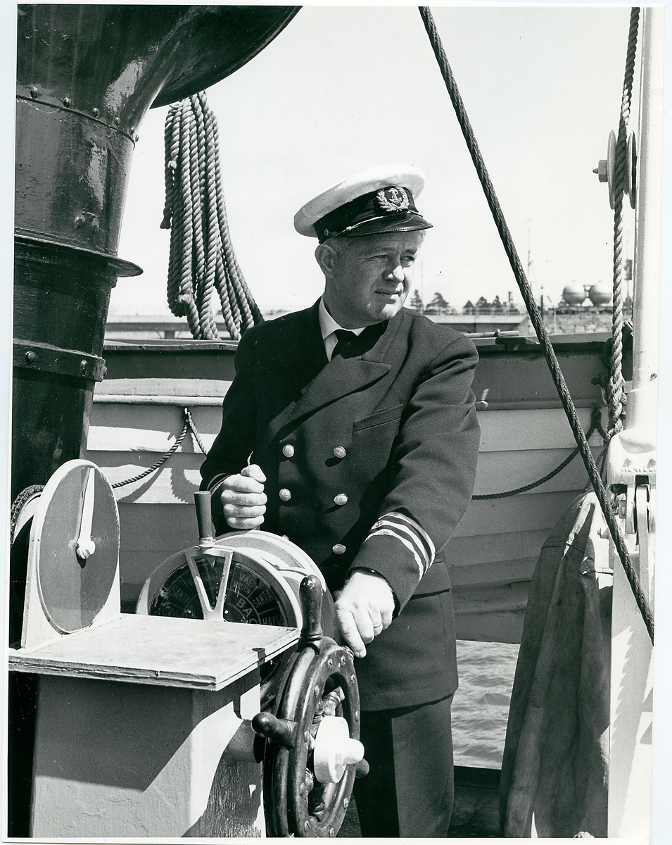 Titel: Willy Moberg vid rodret på bogserbåten "Simson".
