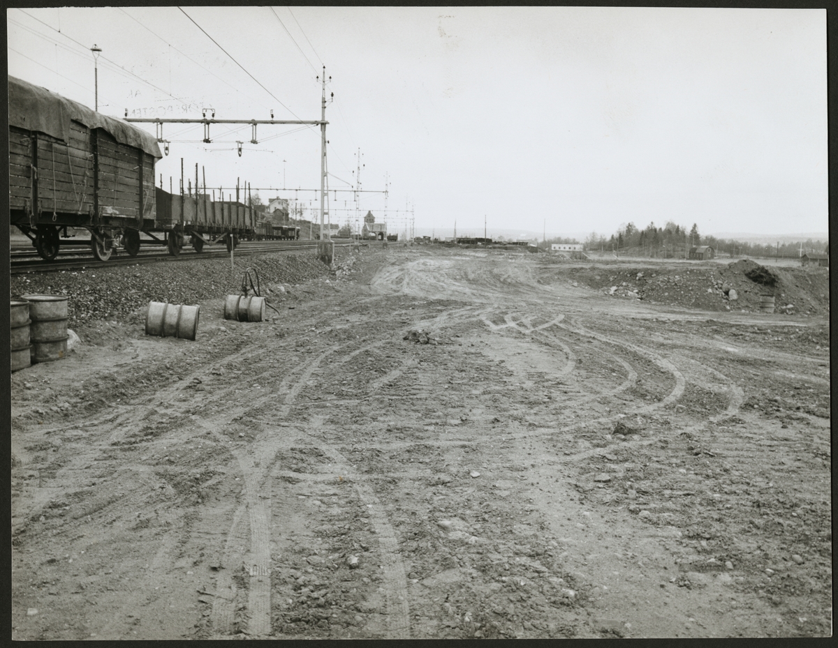 Vy från Storå med kameran riktad mot Lindesberg. I bakgrunden skymtas lokstallet i Storå. Fotot är taget 1958.