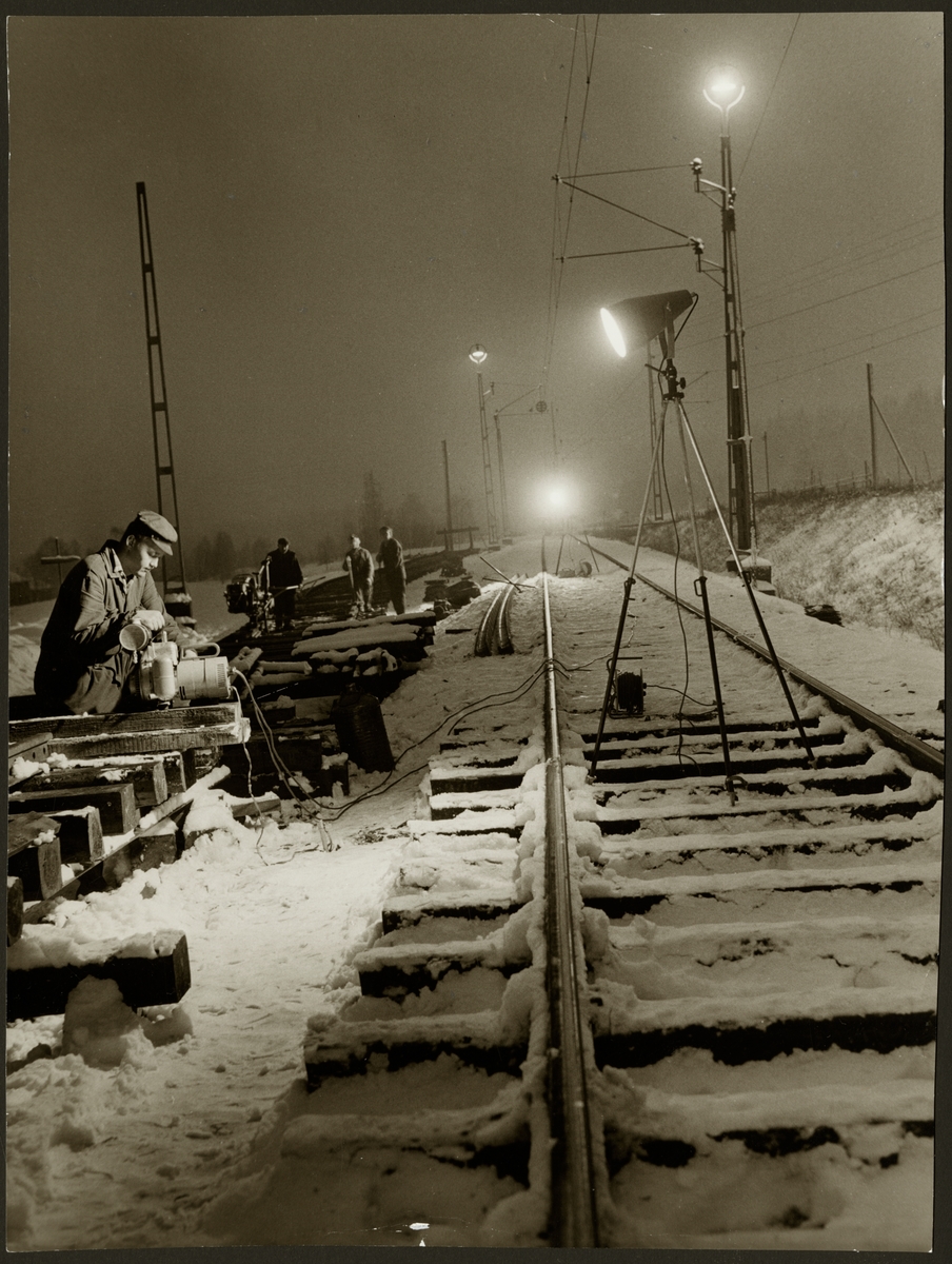 Arbete på spåret i strålkastarljus vid Bångbro station.