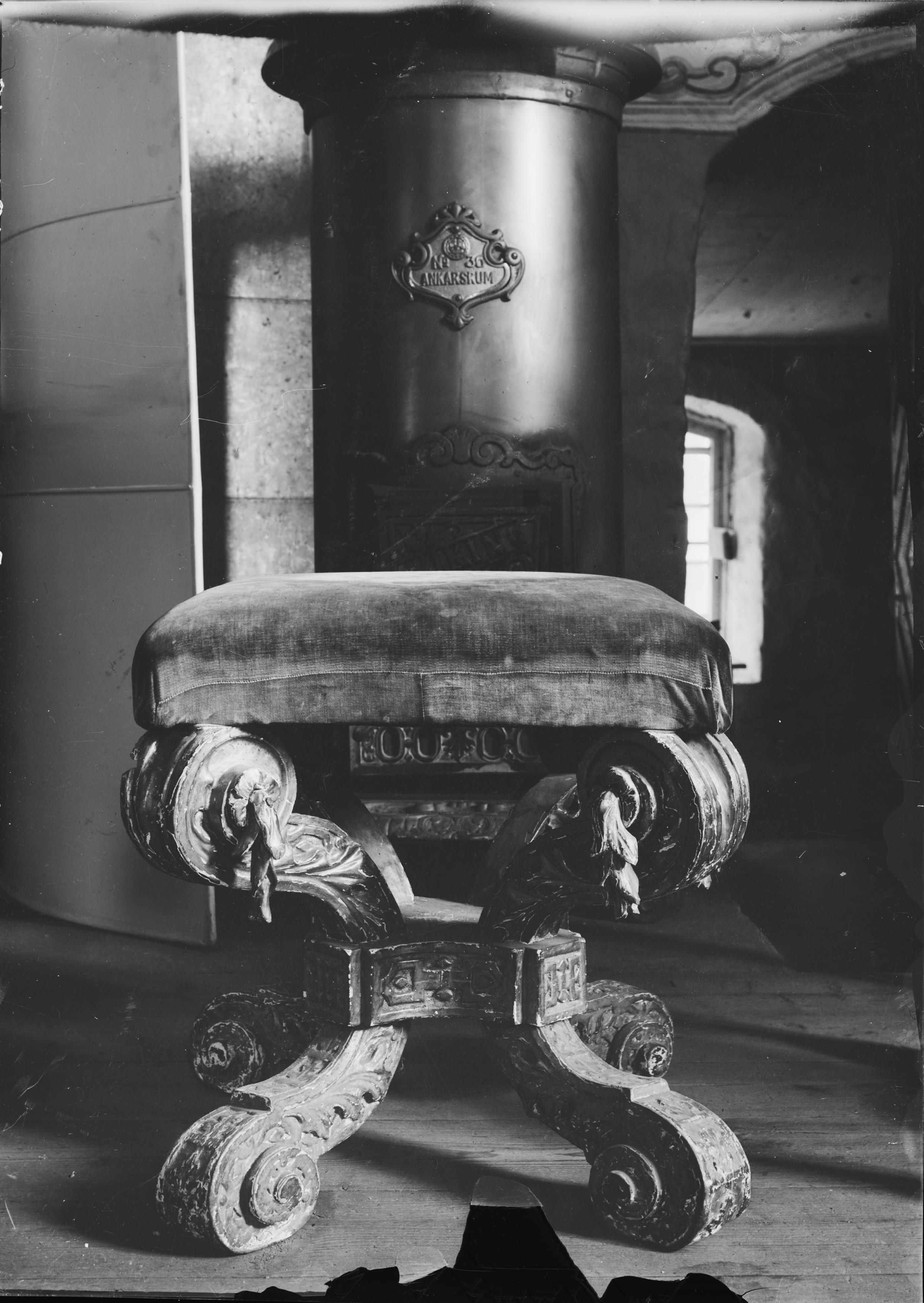Taburett, av snidat och förgyllt trä, klädd med ursprungligen röd, nu blekt sammet. 1600-talet. Snabbinv.