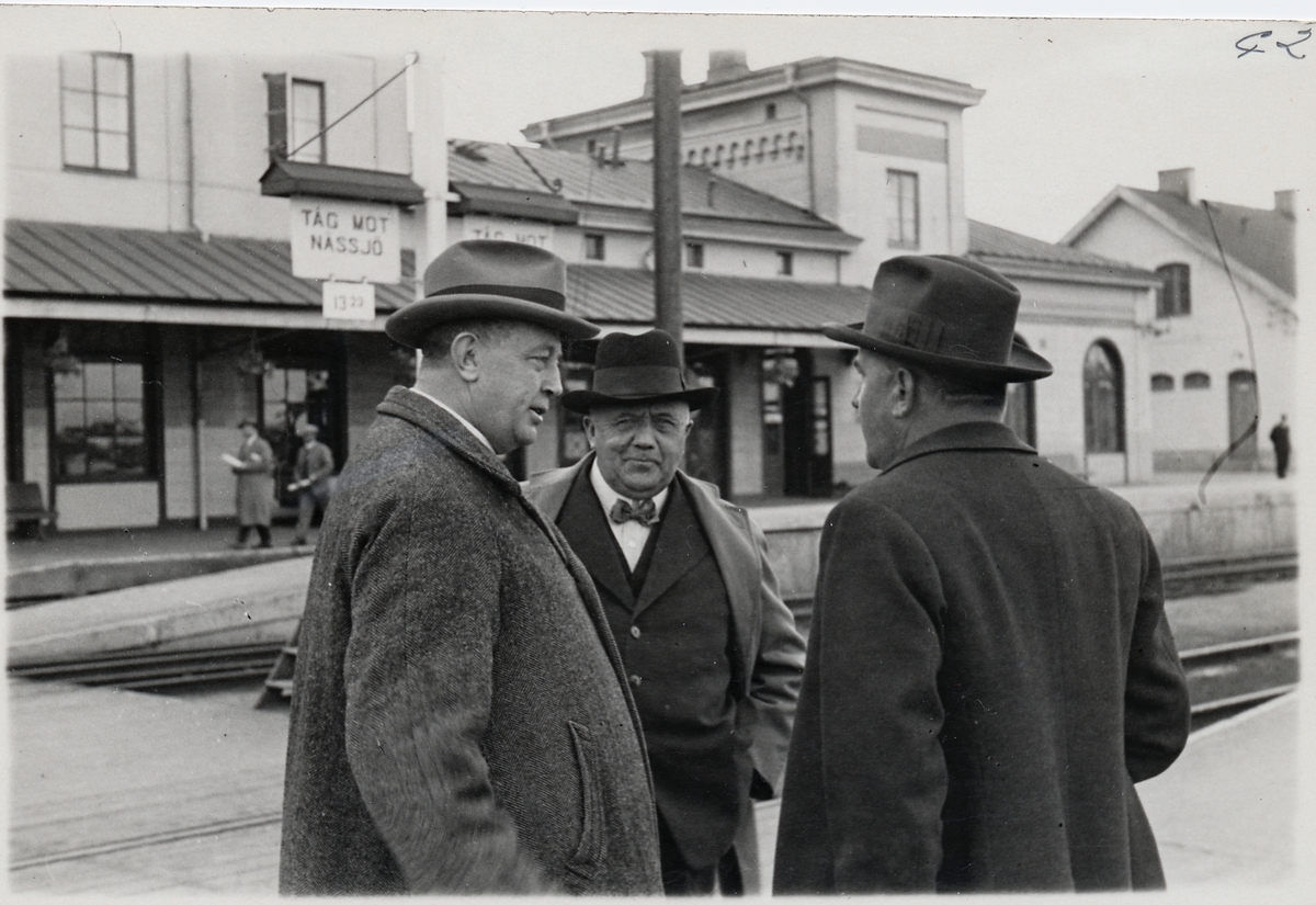 Titel: Tre män utanför järnvägssationen i Jönköping.