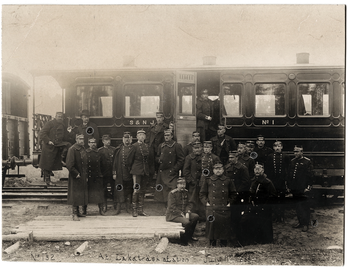 Generalstabsövningar vid Lakaträsk 1888-07-11. Sverige & Norge Järnvägar, S&NJ paradvagn.